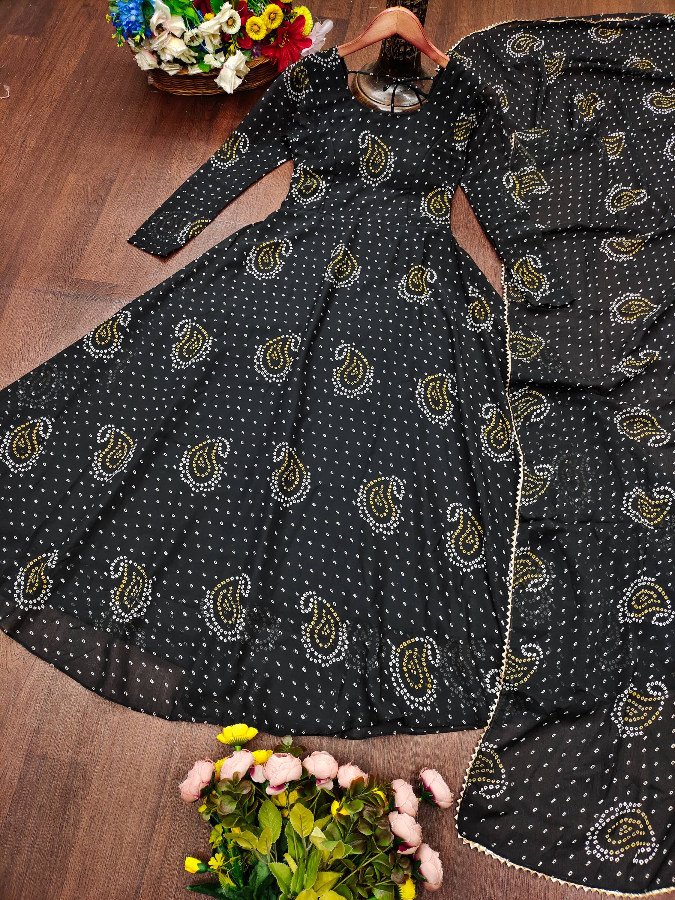 Outer Material: Georgette, known for its lightweight, sheer quality with a slight texture, making it ideal for flowy and elegant styles., Inner Lining: Crepe, a smooth fabric that offers a comfortable feel and adds structure without adding weight., Paisley Print: The timeless paisley print in warm tones gives the outfit a rich, traditional appeal that is perfect for festive occasions or cultural celebrations., Dupatta: The sheer georgette dupatta is designed to flow elegantly around the arms, enhancing the overall feminine charm of the gown., Occasion: Ideal for festive events, family gatherings, weddings, or any occasion where you want to make a statement with a traditional yet modern look., Styling Tip: Pair this gown with statement earrings and ethnic footwear for a complete look that turns heads!