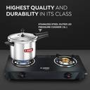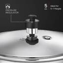 • METALLIC SAFETY PLUG- The safety plug is a back-up safety mechanism and regulates the pressure built up in the cooker, by melting, if the weight valve fails., GASKET RELEASE SYSTEM-A portion of the gasket is pushed out through a slot in the lid, thus releasing the excess steam down and away from the person at the kitchen counter., 5 Year Warranty on Product