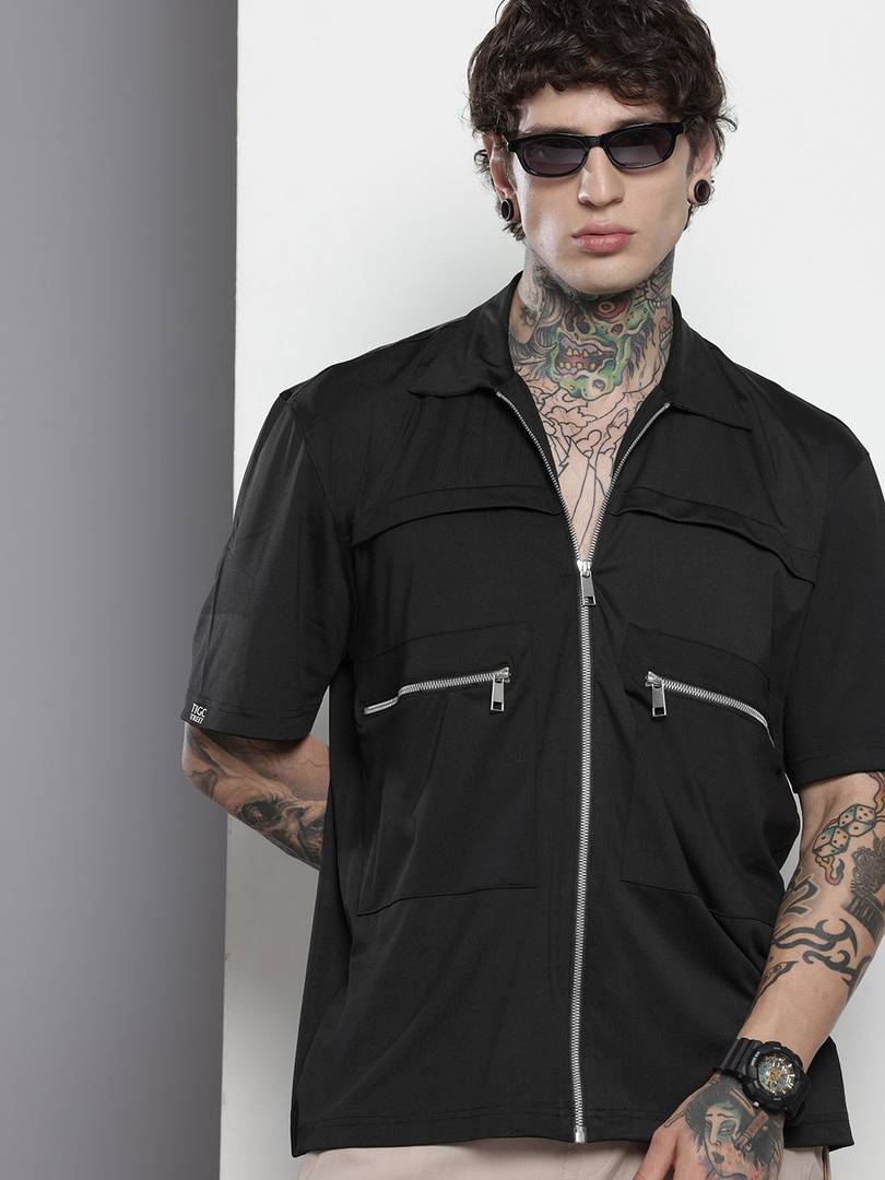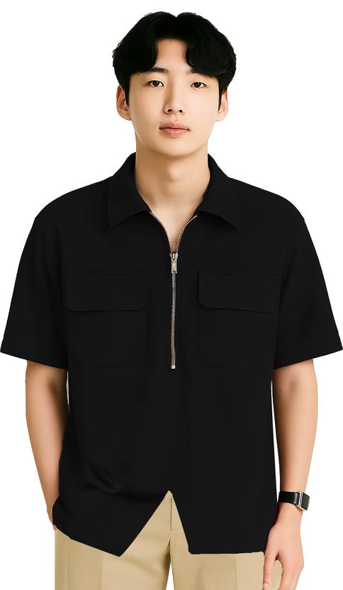 JUGULAR Solid Men Zip Neck Black T-Shirt