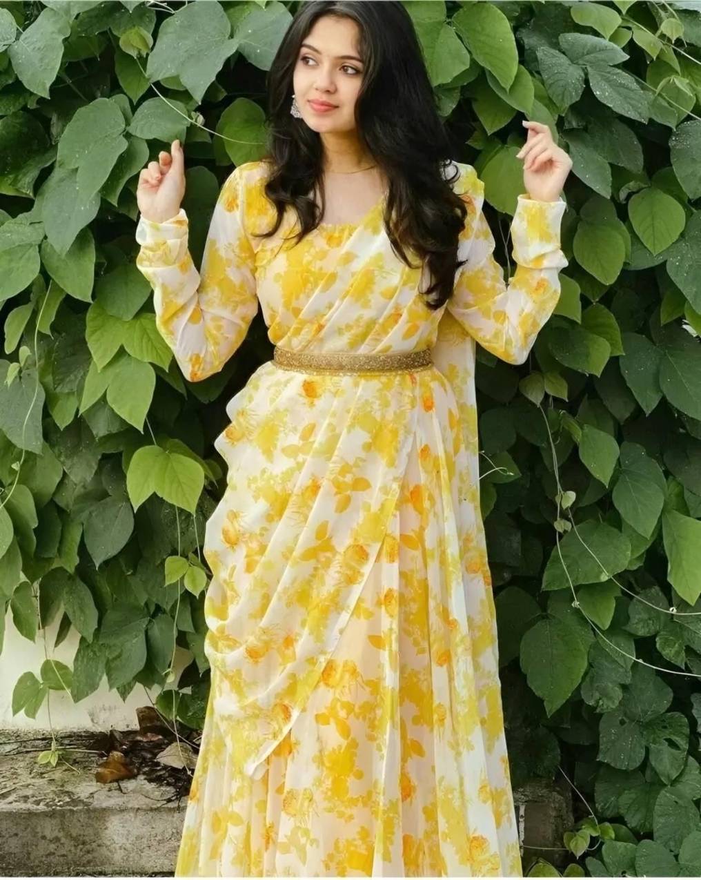 Available 2.20 Meter.Gown Length is 57 Inch. It hasIt has Half Sleeves with Embroidered Work. Gown is Semi-Stitched which can be fitted up to 44 inch Bust Size.