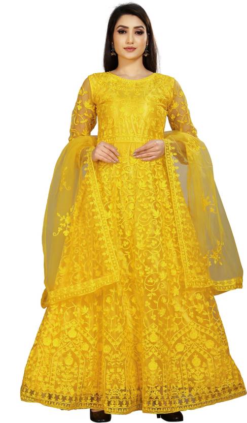 Embroidered Net Semi Stitched Anarkali Gown (Yellow)