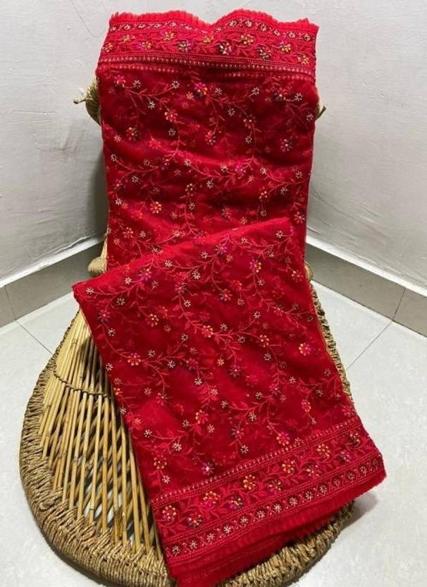 Color: Red, Upgrade your ethnic wardrobe with this stunning Net Embroidered Saree. Made from high-quality Net fabric, this saree exudes grace and charm.With a saree length of 5.25 meters, it provides ample fabric for draping in various styles, allowing you to create different looks for different occasions.The Net Fabric 0.80 meters unstitched blouse piece.Dry Clean Or Normal Hand Wash, Comfortable To Wear Occasions Party Festive Wedding Wear.