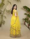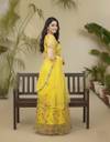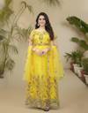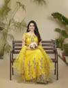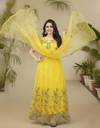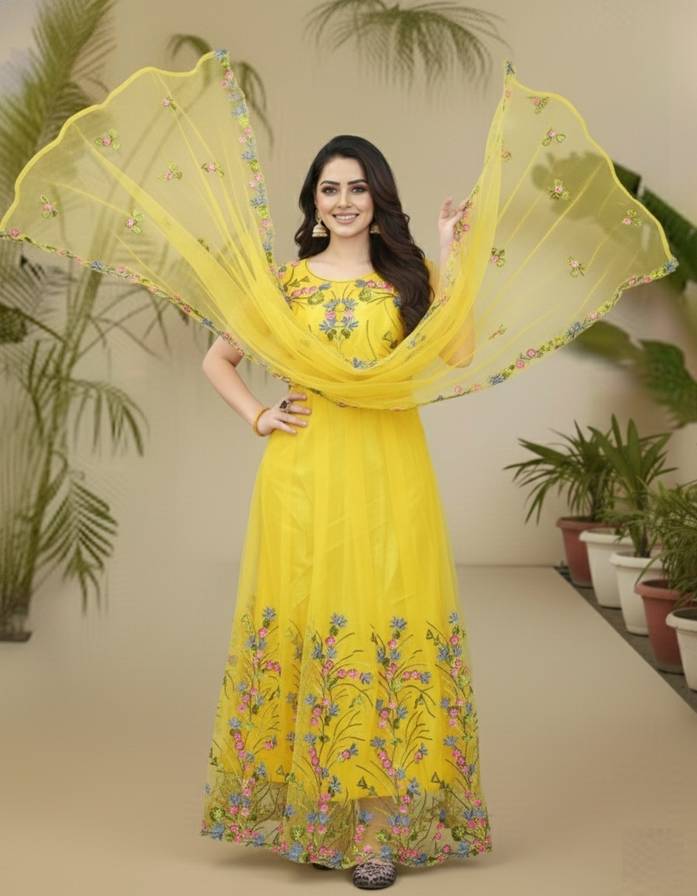 Colour: Yellow, Fabric: Net, Work : Chain Stitch Embroidered, Gown is Comes With Inner and Dupatta Available 2.20 Meter.Gown Length is 57 Inch. It has Short Sleeves with Embroidered Work. Gown is Semi-Stitched which can be fitted up to 44 inch Bust Size. Dry Clean Or Normal Hand Wash.