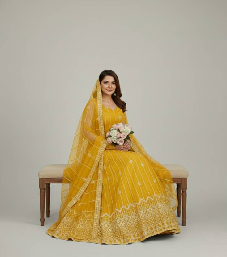 Color : Yellow, Introducing our Women's Net Embroidered Semi-Stitched Gown.The modern woman who appreciates tradition and style will find her ideal match in our Women's Net Embroidered Semi-Stitched Gown. You will look and feel your best on your wedding day thanks to the special quality and to detail that have gone into each piece.Gown is Comes With Inner and Dupatta Available 2.20 Meter.Gown Length is 57 Inch. It has Full Sleeves with Embroidered Work. Gown is Semi-Stitched which can be fitted up to 44 inch Bust Size. Dry Clean Or Normal Hand Wash.