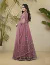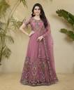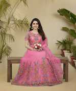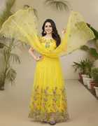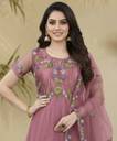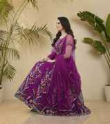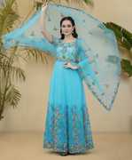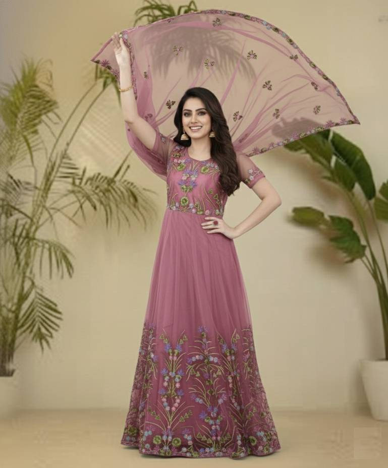 Colour: Peach, Fabric: Net, Work : Chain Stitch Embroidered, Gown is Comes With Inner and Dupatta Available 2.20 Meter.Gown Length is 57 Inch. It has Short Sleeves with Embroidered Work. Gown is Semi-Stitched which can be fitted up to 44 inch Bust Size. Dry Clean Or Normal Hand Wash.