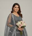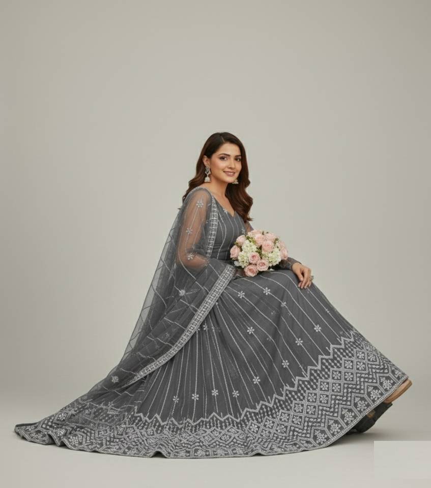 Embroidered Net Semi Stitched Flared/A-line Gown (Grey)
