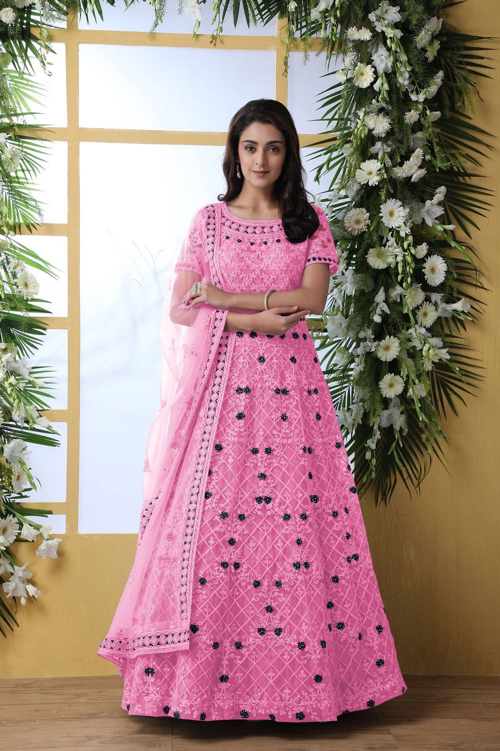 Colour : Pink, Fabric: Net, Work : Chain Stitch Embroidered & Hand Work, Gown is Comes With Inner and Dupatta Available 2.20 Meter.Gown Length is 57 Inch. It has Half Sleeves with Embroidered Work. Gown is Semi-Stitched which can be fitted up to 44 inch Bust Size. Dry Clean Or Normal Hand Wash.