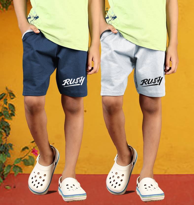.Give your little one the perfect blend of comfort and style with this vibrant combo pack of boys' cotton shorts featuring the bold "RUSH" print. Designed for active kids, these shorts are crafted from soft, breathable cotton fabric that keeps them cool and comfortable throughout the day—whether they’re running around the playground, lounging at home, or heading out for casual outings. Each pair features an elasticated waistband for a snug yet flexible fit, while spacious side pockets add both practicality and flair. The trendy "RUSH" typography printed on the front leg gives a sporty, modern edge, appealing to young boys who love to stay on the move in style. With five versatile color options—navy blue, olive green, white, greyish blue, and black—this combo offers variety for everyday wear. Whether paired with a casual tee or a tank top, these shorts promise effortless dressing and endless comfort. Ideal for summer wear, daily wear, or travel, this multipack of stylish, easy-to-wear shorts is a must-have addition to any boy's wardrobe.This combo pack of 5 boys' shorts is designed for energetic kids who want to move freely and look effortlessly stylish. Made from soft, breathable cotton, these shorts are perfect for Indian summers. The elastic waistband allows for a secure yet flexible fit, ideal for active play or relaxed lounging. Each pair features a bold “RUSH” print in vibrant colors that won’t fade, even after multiple washes. Whether for casual wear, vacations, or daily outdoor fun, these shorts are a must-have wardrobe essential.With five versatile shades in one pack—each with a distinct “RUSH” design—this combo gives your child a stylish new look every day of the week. A smart value-for-money option for parents looking for quality, function, and fashion in one purchase.