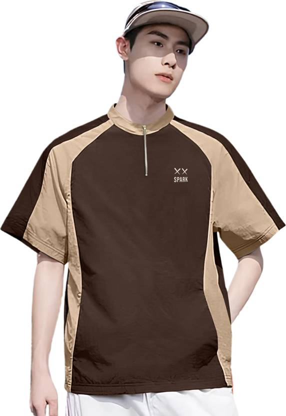 Jump Cuts Colorblock Men Henley Neck Brown, Beige T-Shirt