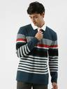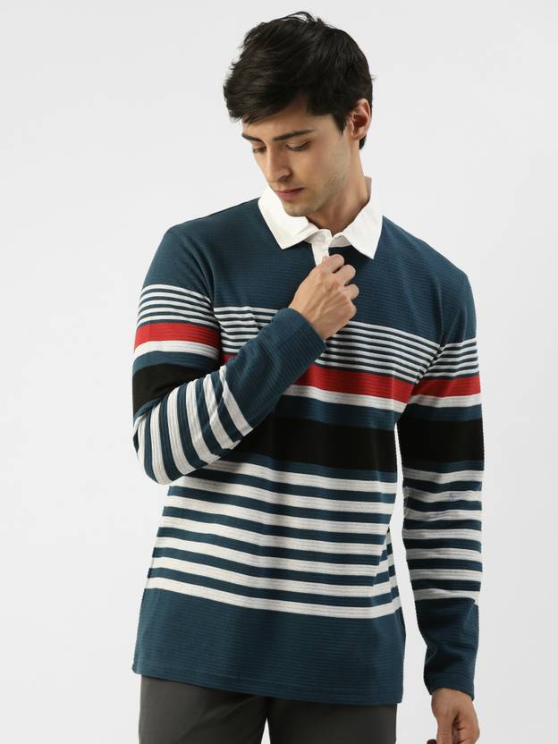Jump Cuts Men Striped Polo Neck Cotton Blend Dark Blue, White, Red T-Shirt