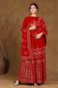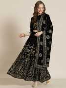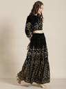 The fabric known for its lustrous look “velvet” , this black printed lehenga choli with three fourth sleeves and cuff. Detailed with front keyhole neckline to give the look a beautiful appearance. The lehenga has elasticated waistband and side closure.