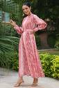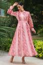Pause Here Your Scrolling For One Of The Best Ethnic Outfit. This Chiffon Digital Printed Maxi Dress Is Available In Peach Color. The Sleeve Type Is Perfect Puff Sleeve. The Detailing Of Cuff Is Of Cotton Lining Finishing. The Closure Is Present At Back As Loop Button Closure.