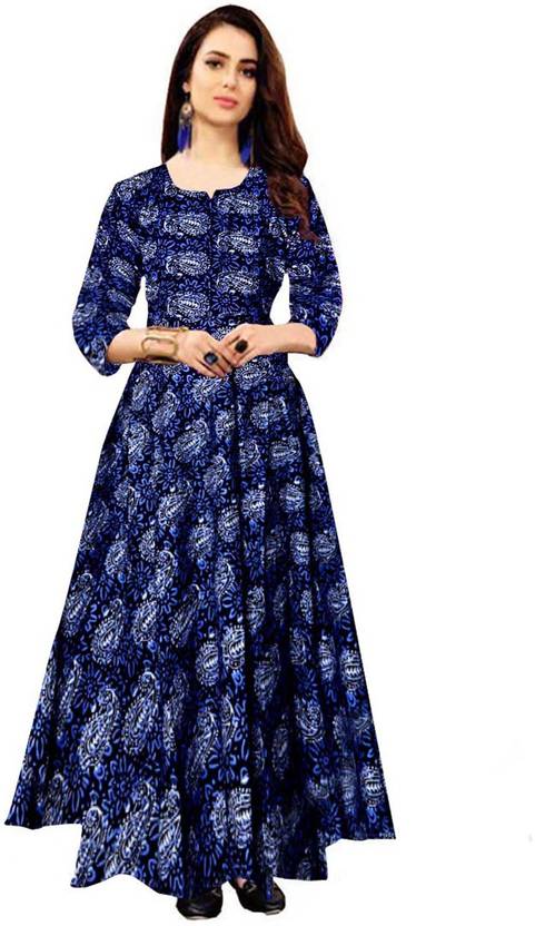 JWF Printed Cotton Rayon Stitched Flared/A-line Gown (Dark Blue)