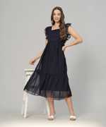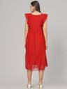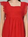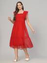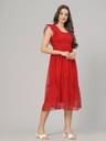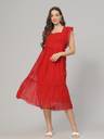 Radiate charm in this Red women's dress, adorned with cap sleeves featuring delightful frills. Crafted from airy poli crape or dobby fabric, it gracefully falls to calf length with a flattering flair. The dress is enhanced by a smooth rayon inner lining for comfort. A chic square neck completes the look, making it a perfect ensemble for any occasion with its blend of style and grace.