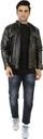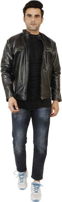 This stylish regular fit jacket in the display has full sleave and stand collar. Inside one pocket and branded zippers, this faux leather jacket is light in weight and will ensure cofort all time.