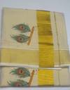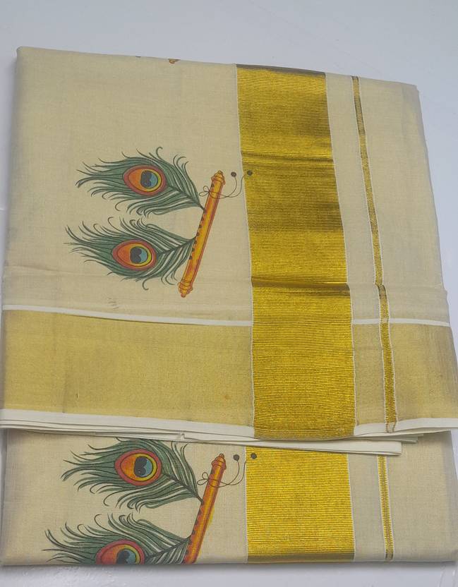 Embrace traditional elegance with this beautiful Kerala Kasavu Saree featuring a stunning Krishna flute and peacock feather design. Crafted from premium cotton-blend fabric, this saree offers a soft, breathable feel perfect for festive and cultural occasions. The classic ivory base with a golden zari border adds a royal charm, while the divine flute and feather motifs highlight spiritual grace and artistry.