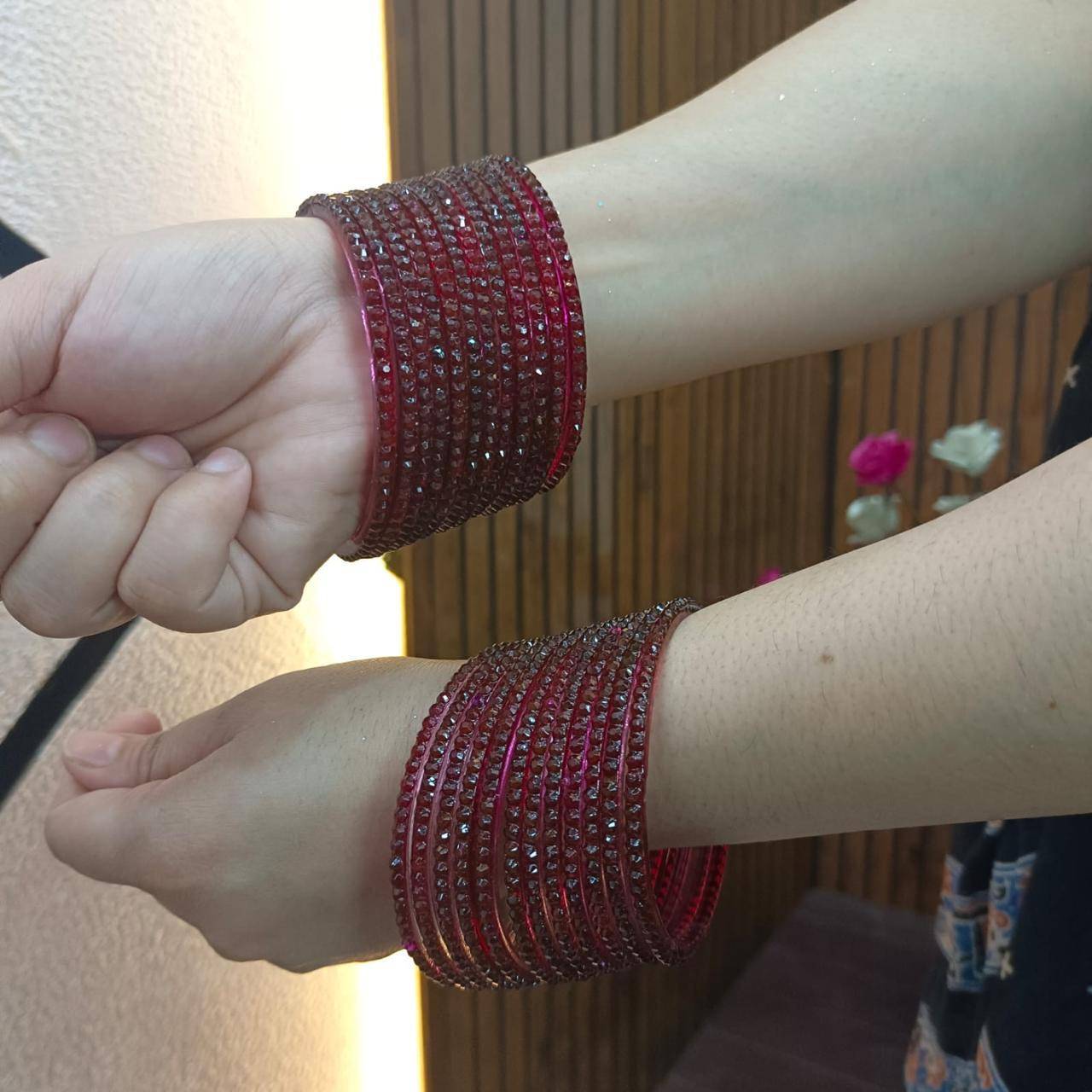 Add a touch of glamour to your ethnic look with the stunning Mehira Sparkle Bangles. Designed with shimmering stone work on a vibrant maroon base, these bangles bring out the perfect blend of tradition and modern style. Ideal for festive occasions, weddings, or casual ethnic wear, they add an instant glow to your outfit.