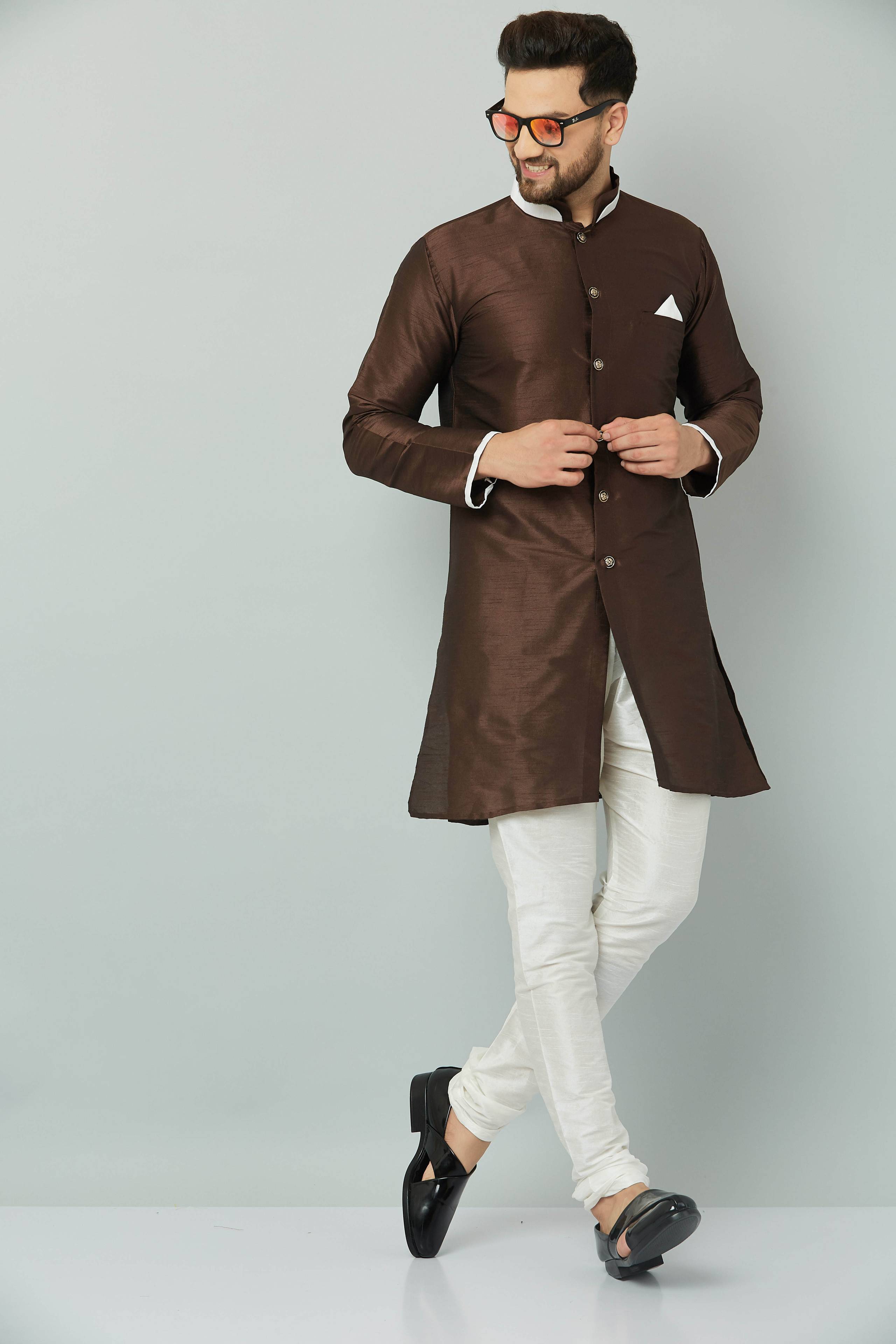 KAIFOO, We take pride in our commitment to maintain quality standards in each piece manufactured by us. A true epitome of class, long kurta will surely reflect your impeccable taste in fashion. Made from banarsi dupion silk fabric, this set will surely make you the cynosure of all eyes. Team this jacket with a pair of mojris or kolhapuri chappals to give a classy touch to your ethnic look.