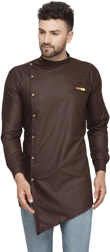 Men Solid Cotton Blend Asymmetric Kurta (Brown)