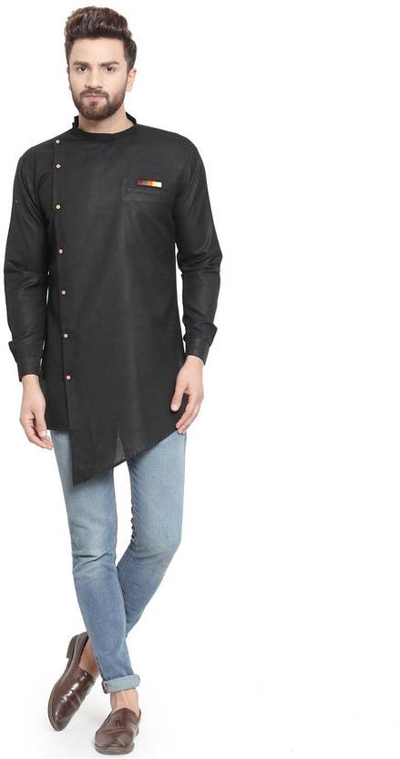 Men Solid Cotton Blend Asymmetric Kurta (Black)