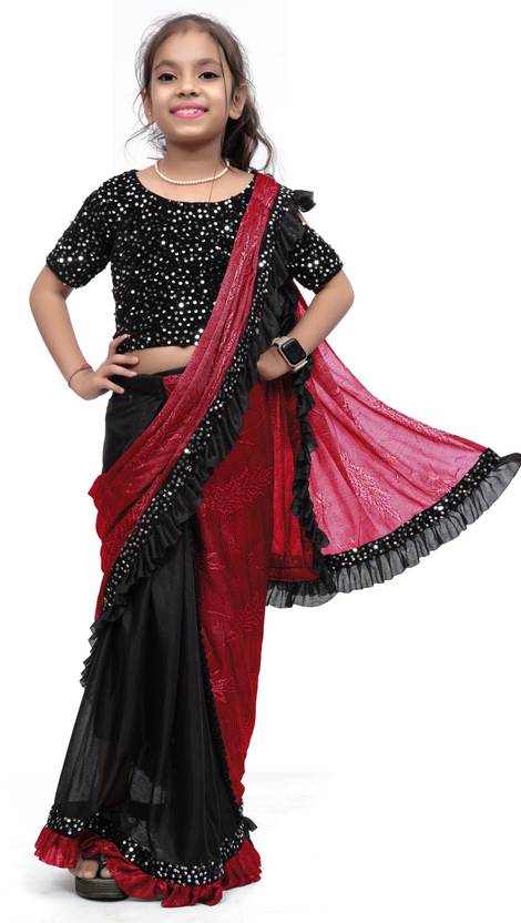 Lycra Blend Ready To Wear Ruffle Saree Is Specially Designed For The Most Gorgeous Baby Girls. This Fully Embellished Saree Is Made Out From The Soft Lycra Material That Is Stitched & Light In Weight,