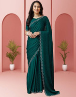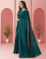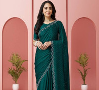 Thanks to its embellished dotted pattern, this women's saree carries a subtle sparkle across the drape. Furthermore, each dot is placed with care and further enhanced with Swarovski crystal work that adds gentle light-catching accents. Along the edges, a thin, scalloped border showcases intricate floral embroidery that lends a refined finish. The combination of shimmer and delicate detailing gives this saree a graceful presence without overwhelming your outfit.