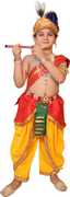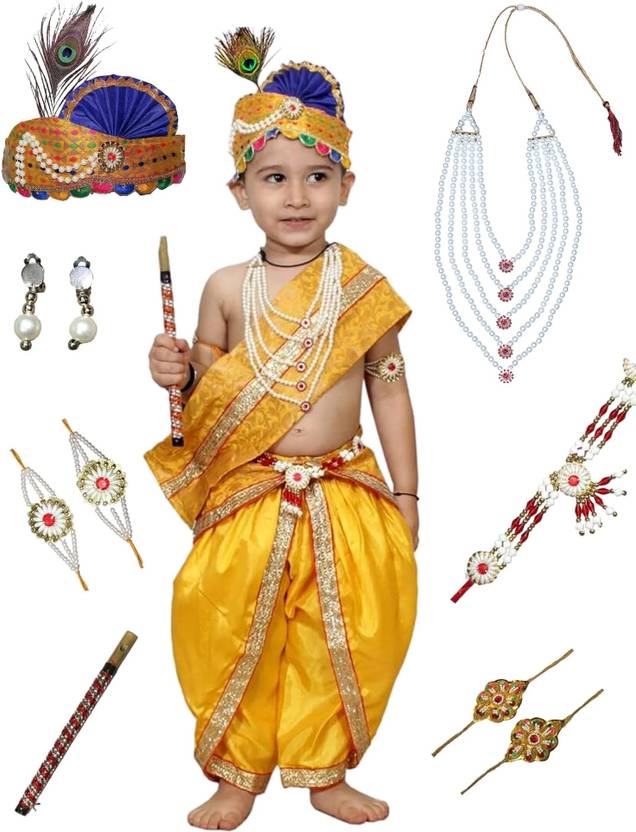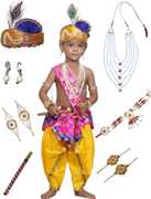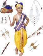 Dress your child as Lord Krishna with this captivating ensemble. Allow your child to embrace the enchanting persona of Lord Krishna with this authentic set, Complete Set: Includes 1 Dhoti set, 1 Patka (Dupatta), 1 Belt, 1 Fabric Mukut, 1 5-line mala, 1 pair of Bajuband, 1 moti bajuband, 1 set of earrings, 1 bansuri, and morpankh., Fabric Material: Crafted from a combination of silk and polyester, ensuring a comfortable and durable fit., Ideal for Krishna-themed Events: Perfect for fancy dress competitions, cultural festivals, school functions, and religious celebrations. The striking multicolored design adds a festive touch to the Krishna attire., Wash Care: Dry clean recommended. Do not iron directly on the print. Wash dark colors separately to maintain the costume's quality and color vibrancy.