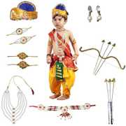 ✅ Dress your child as Lord Ram with this captivating ensemble. Allow your child to embrace the enchanting persona of Lord Ram with this authentic set, ✅ Complete Set: Include 1 Dhoti, 1 Patka, 1 Belt, 1 Mukut, , 1 5line Mala (necklace), 1 pair of Bajuband (armlet), 1 moti bajuband, 1 earring, 1 Dhanush, 1 Tarkash and teer., ✅ Fabric Material: Crafted from a combination of silk and polyester, ensuring a comfortable and durable fit., ✅ Ideal for Ram-themed Events: Perfect for fancy dress competitions, cultural festivals, school functions, and religious celebrations. The striking multicolored design adds a festive touch to the Ram attire., ✅ Wash Care: Dry clean recommended. Do not iron directly on the print. Wash dark colors separately to maintain the costume's quality and color vibrancy.