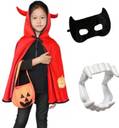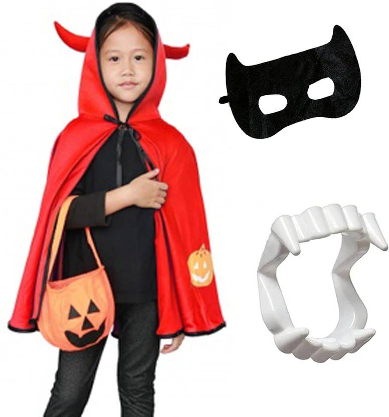 Robe Hooded Cape, Devil Horn, Teeth, Black Eyepatch for Halloween - 10-12 Yrs
