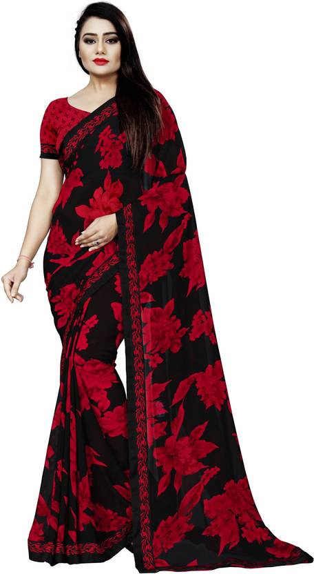 A saree has an inherently feminine and timeless appeal about it. When you splash it with a pretty black red colored floral print, you get a saree that's a real looker. Own the social scene in this synthetic georgette saree. Just when you think things can't get better, this saree has heavy double lace border on the side which gives it a regal look.