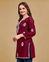 Introducing our rayon chikankari kurti for women. This luxurious chikan embroidery short kurti is made from lightweight fabric and features an intricate chikankari thread work, perfect for elevating your summer and casual wardrobe. Our chikankari top kurta helps you to channel elegance and a refreshing. Be it festivities, parties, travel trips, informal meetings or casual gatherings, Kalavrund's chikankari lucknowi kurti is a perfect choice anytime.