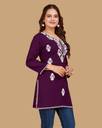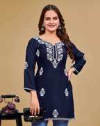 Introducing our rayon chikankari kurti for women. This luxurious chikan embroidery short kurti is made from lightweight fabric and features an intricate chikankari thread work, perfect for elevating your summer and casual wardrobe. Our chikankari top kurta helps you to channel elegance and a refreshing. Be it festivities, parties, travel trips, informal meetings or casual gatherings, Kalavrund's chikankari lucknowi kurti is a perfect choice anytime.