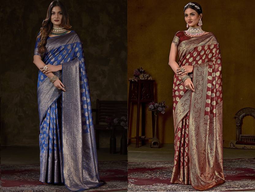 Kamya Woven Kanjivaram Art Silk Saree (Pack of 2, Light Blue, Maroon)
