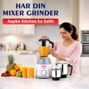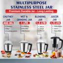 Equipped with four premium stainless steel jars, including a 1.5L wet jar, 1.25L juicer jar, 1L multi-purpose jar, and 0.4L chutney jar, this mixer grinder is designed for versatility and precision. Whether you’re preparing smooth batters, grinding spices, or making fresh juices, the super-efficient stainless steel blades guarantee fine and uniform consistency.