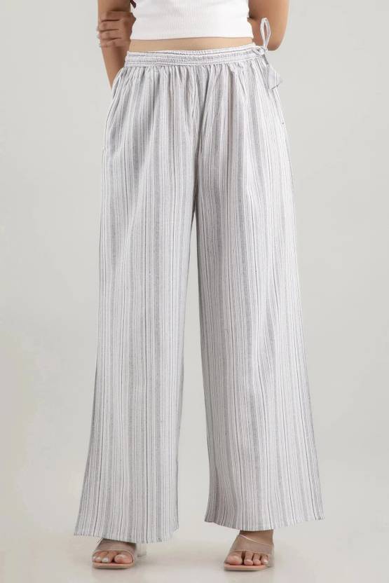 KANCHUK Brand .We are offering you a Palazzo for Women in Super Soft Cotton in different colors. The Cotton Palazzo is a versatile and stylish garment that combines the comfort of Cotton fabric with the elegance of palazzo pants. Palazzo is also known to called as Plazo Pant / Plazo Trouser. In summary, Cotton Palazzo pants is a Trendy Palazzo now a days which offer a blend of comfort, elegance, and versatility, making them a popular choice in contemporary fashion. Here are some key features and characteristics: Material: Made from super soft cotton fabric known for its soft, smooth texture and excellent drape. Cotton is breathable, making it a comfortable choice for various climates. Design: Palazzo pants / Palazzo Trousers for Women's or Girl's are characterized by their wide legs that flare out from the waist, providing a flowing and relaxed silhouette. This design is both stylish and flattering for many body types. Comfort: The elastic or drawstring waistband adds to the comfort, allowing for a customizable fit. The lightweight nature of cotton ensures ease of movement, making them ideal for both casual and semi-formal settings. Versatility: Cotton Palazzo pants can be dressed up or down. Pair them with a simple top and sandals for a casual day out, or with a more formal blouse and heels for an evening event. Patterns and Colors: Available in a wide range of colors, prints, and patterns, including solids, florals, and ethnic designs. This variety allows for personal expression and versatility in styling. Care Instructions: Generally, Cotton requires gentle care. It's often recommended to easy wash or use a delicate cycle in the washing machine, and to air dry to maintain the fabric's quality and prevent shrinkage.Women cotton strip printed palazzo with tussle work and Pocket.