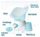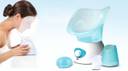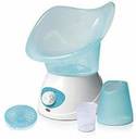 Kill skin bacteria and suppress acne, restore the inherent qualities of your skin. Unique design keeps the consumer in mind, you will also enjoy an extra-wide facial shield. This design enhances comfort during use Features a power indicator light and an automatic thermostat for added safety. How To Use: The versatility comes from two translucent, blue, plastic cones. One is a narrow sinus cone, and the second larger cone is 6-3/4" wide and has a flared, open side to accommodate the entire face. This Facial Sauna System also features a facial tool with a gentle exfoliating brush and sponge for applying moisturizer, as well as a safe automatic shutoff and timer. Place your nose with your forehead touching the curved rim.