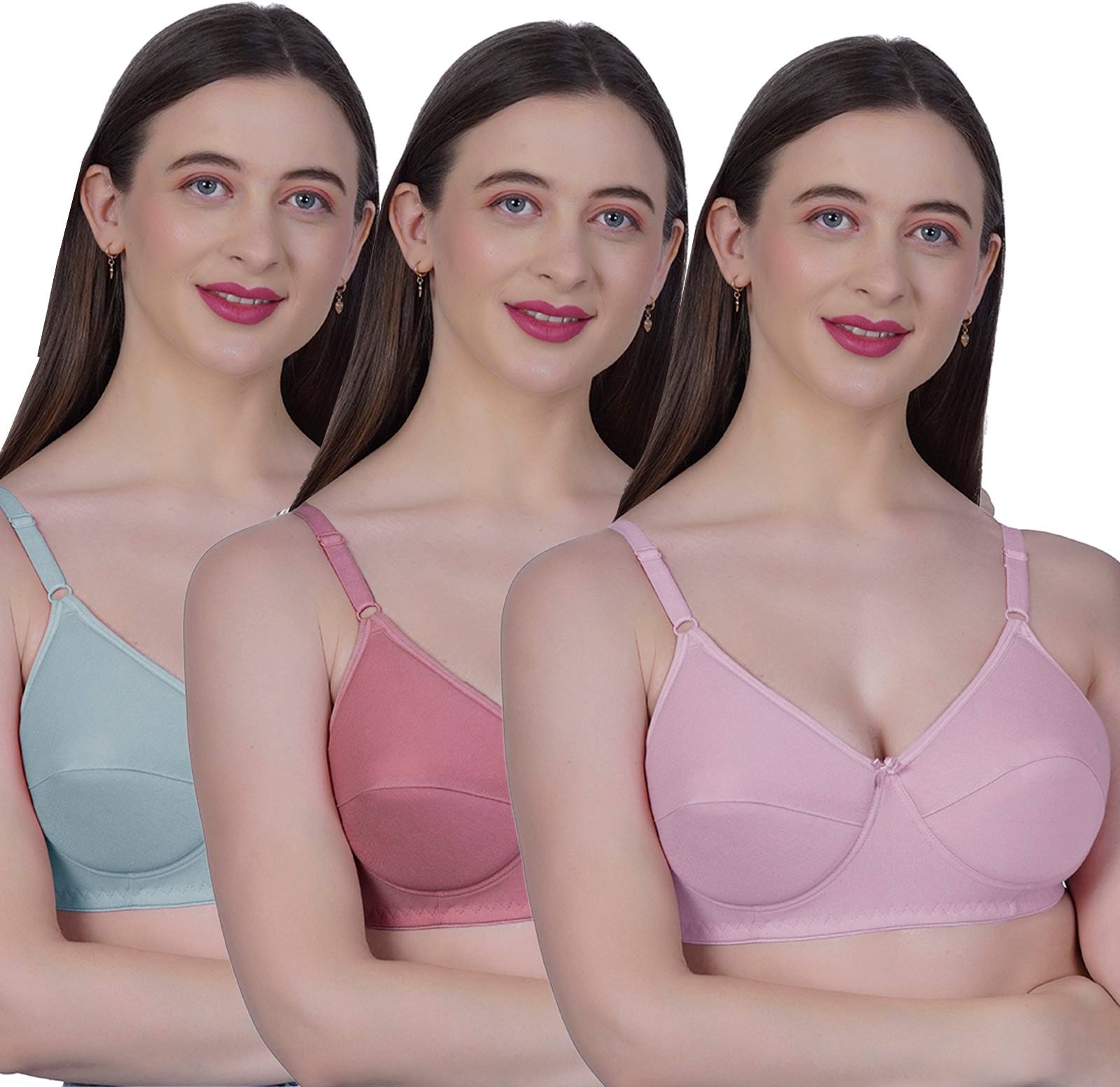 Designed for the modern woman seeking both style and support, the bras in this set boast a full-coverage design. Featuring a three-hook and eye back closure for a secure fit, movable straps for customisable wear, and soft elastic for added comfort, these bras offer a suitable blend of functionality and fashion. And, the seamless, unwired, and unpadded construction ensures a natural shape and silhouette, allowing you to move with confidence and grace.