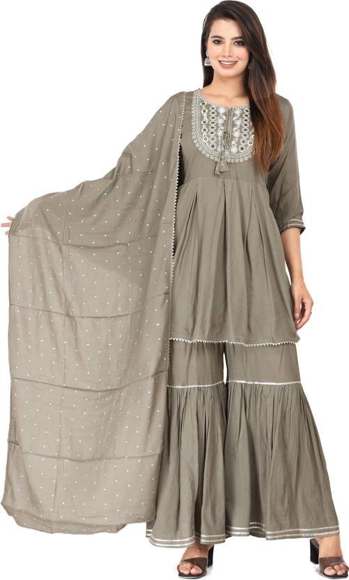 Women Viscose Rayon Kurta Sharara Dupatta Set