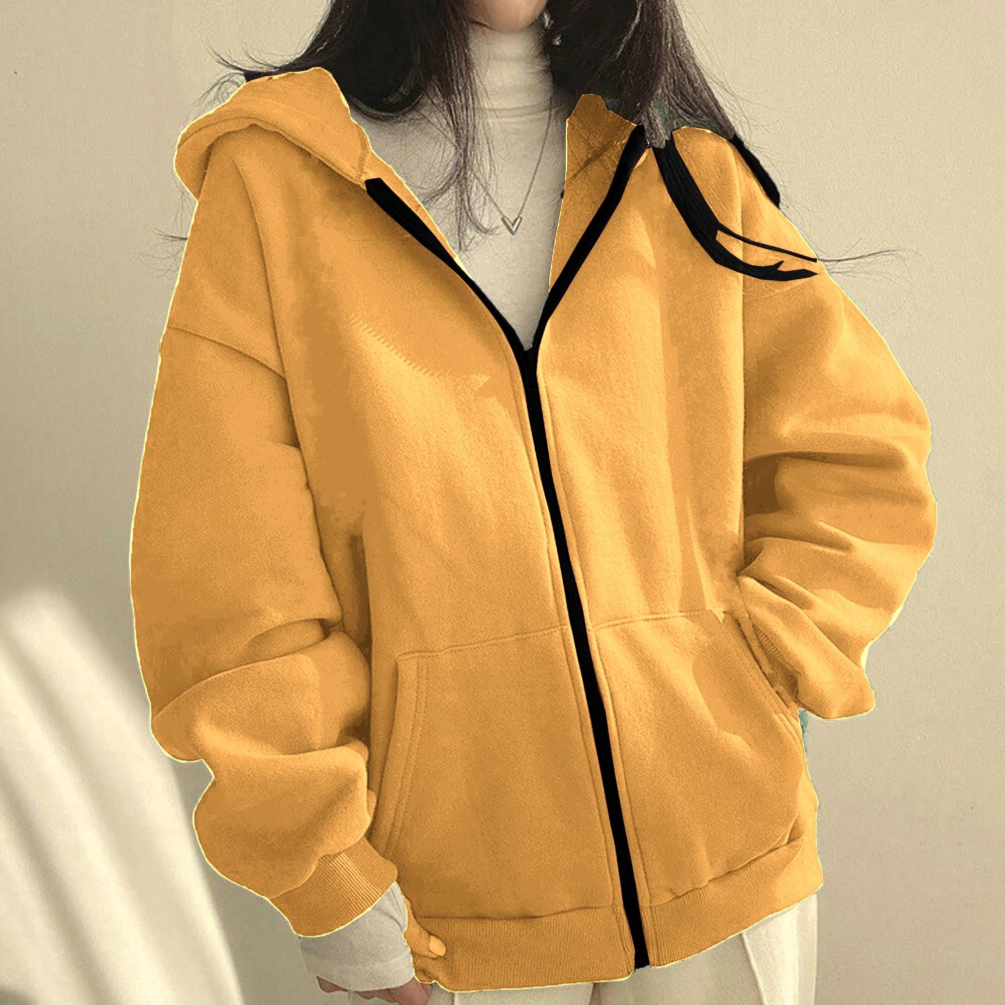 this Women Solid Full Sleeve Hooded Neck Sweatshirt. Crafted from premium fleece fabric, it offers ultimate comfort, softness, and warmth throughout the day. Designed with a front zipper closure, it allows easy wear and adjustable ventilation, making it perfect for all-day use. The hooded neck design adds an extra layer of protection against cold winds, while giving you a trendy, sporty look.