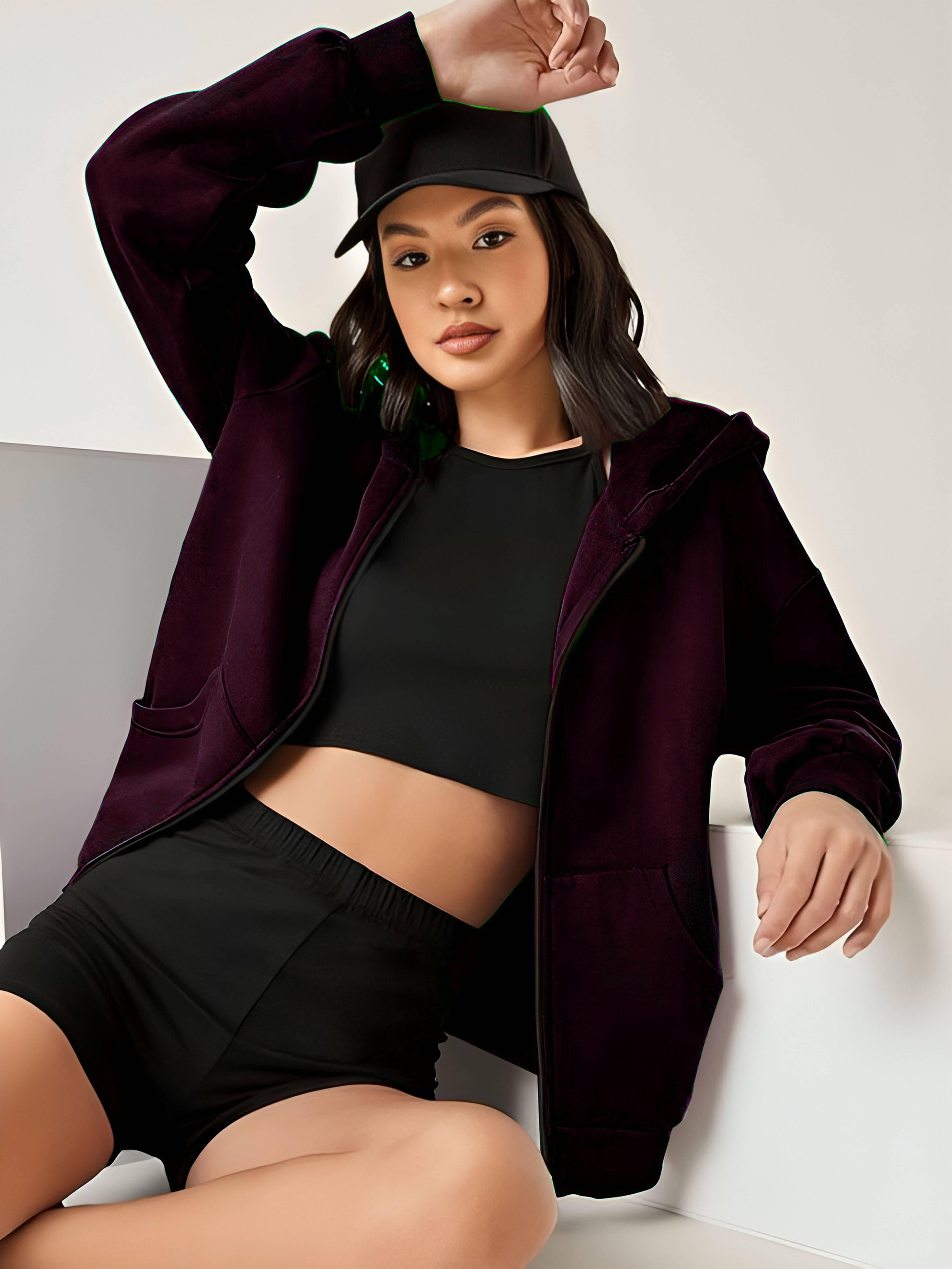 this Women Solid Full Sleeve Hooded Neck Sweatshirt. Crafted from premium fleece fabric, it offers ultimate comfort, softness, and warmth throughout the day. Designed with a front zipper closure, it allows easy wear and adjustable ventilation, making it perfect for all-day use. The hooded neck design adds an extra layer of protection against cold winds, while giving you a trendy, sporty look.
