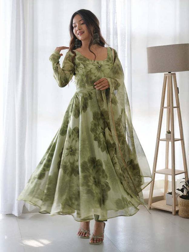 Add graceful charm to your ethnic collection with this beautiful Green Floral Printed Anarkali Gown, perfect for festive and special occasions. Made from soft and flowy georgette fabric, this gown offers a lightweight feel and elegant fall that enhances your overall look. The soothing green color combined with delicate floral prints creates a refreshing and classy appearance suitable for day or evening wear.