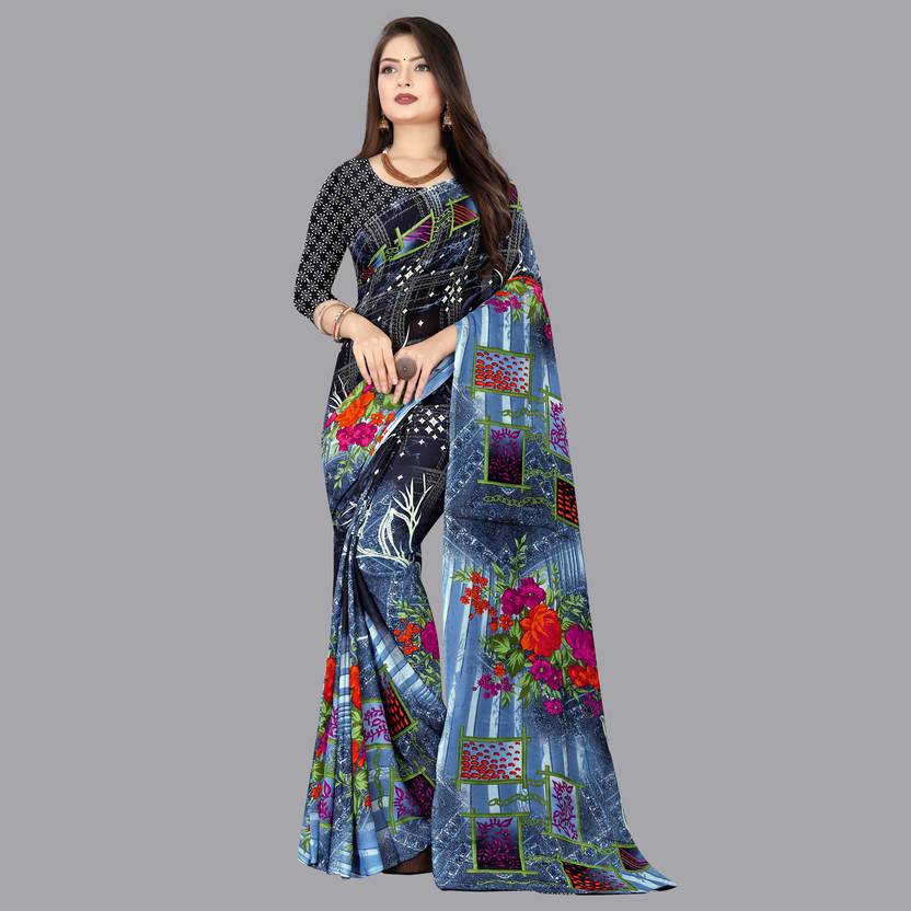 We unfurl our the intricacy and exclusivity of our creations highlighted in this majesty daily wear fashion saree. The saree is made of faux georgette fabric, enhanced with lovely
