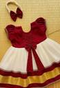 Imagine her tiny hands reaching for the soft, maroon chiffon bodice, adorned with delicate embellishments that twinkle like stars. The skirt, a cloud of white, dances with every step, its hem a delightful surprise of maroon and gold stripes, finished with a touch of delicate trim.