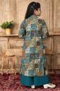 The outfit features a vibrant mosaic-inspired print with intricate patterns, beautifully arranged on the jacket and kurti. The teal base color enhances the richness of the design, making it perfect for festive occasions, parties, and cultural events. The jacket is embellished with a decorative tie-up detail , adding a touch of sophistication.