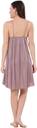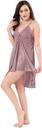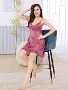 woman modeling a stylish satin nightdress in a soft mauve or dusty rose color. The nightdress has delicate lace detailing along the V-neckline and hem, with a small bow accent at the center of the bust, adding a touch of femininity. The spaghetti straps and smooth, flowing fabric provide a lightweight and comfortable fit, ideal for sleepwear or lounging. The hemline is slightly ruffled, giving the piece an elegant and playful finish. The model is barefoot, standing confidently against a plain white background, showcasing the garment clearly.