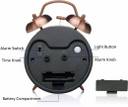 | Other Functions | - Spring wound mechanical brass movement. Mechanism features solid brass plates, brass gears, and steel shafts and pivots Vintage look table Alarm clock with led light perfect for home and office desk Battery included in packaging Loud twin bell, EASY TO SET : Battery Operated. This alarm clock has four buttons: Two dials to set clock and alarm time, one alarm switch and one nightlight button. This alarm clock is very easy to set and use, suitable for most people., RETRO STYLE: Beautiful vintage twin bell alarm clock, harmonious collocate with your desk and bedroom, retro style takes you back to 80's.