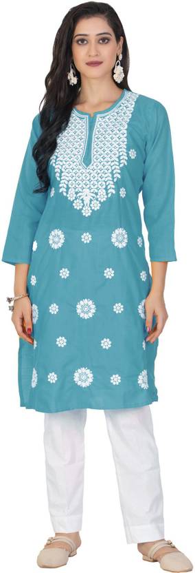 Fancy this season thrills with the timeless chikankari kurtis to add nazaaqat to your style statement.Old famous Chikankari, an artfully done embroidery with mostly white resham and cotton threads. kbee brings this artistic and delicate apparel to you, straight from the heart of Chikankari i.e Lucknow.Embroidered by traditional indian craftsmen on cool shades of soft fabrics like cotton, georgette, muslin etc. Chikankari adds an earthed indian flavour to your wardrobe.This Kurti speaks royalty, tradition,elegance, boldness,comfort,fashion with Nazaaqat all at once.Paired right with different matching accessories and chikankari bottom, this outfit can be flaunted in casual wear, workplace,small outings or even festivals/occasions.A 40-inch long straight kurta with comfortable side-slits gives your body a toned and sleek look.Most gracious and neat, round-neckline to flaunt a contemporary statement.3/4th sleeves cater elegance with style.