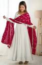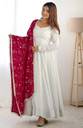 Elevate Your Ethnic Wardrobe With Kedar Fab Stunning White Georgette Fabric Anarkali Style Kurta With Elegant Churidaar Sleeves, Exuding Timeless Grace. The Set Is Paired With A Rich Pink Georgette Dupatta, Adorned With Intricate Sequence Embroidery For A Touch Of Luxury. The Dupatta Features A Delicate Fringed Lace Border, Enhancing Its Ethnic Charm. Perfect For Festive And Special Occasions, This Ensemble Combines Elegance And Comfort Effortlessly.