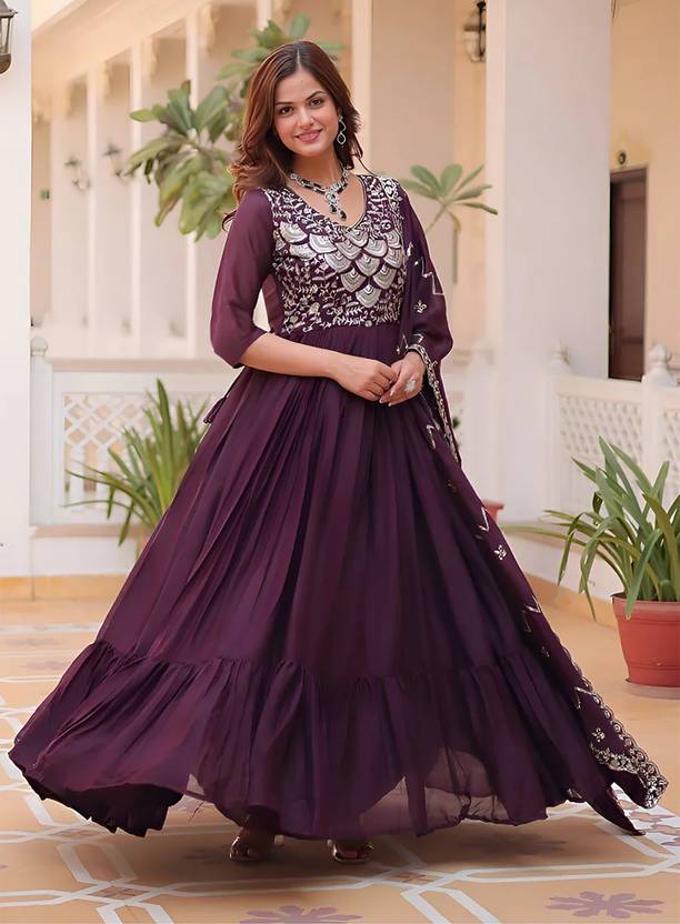 Flared Hemline Gown, Sequence Embroidered Gown, Anarkali Style Gown Set, Georgette Fabric Gown Set, Micro Silk Inner