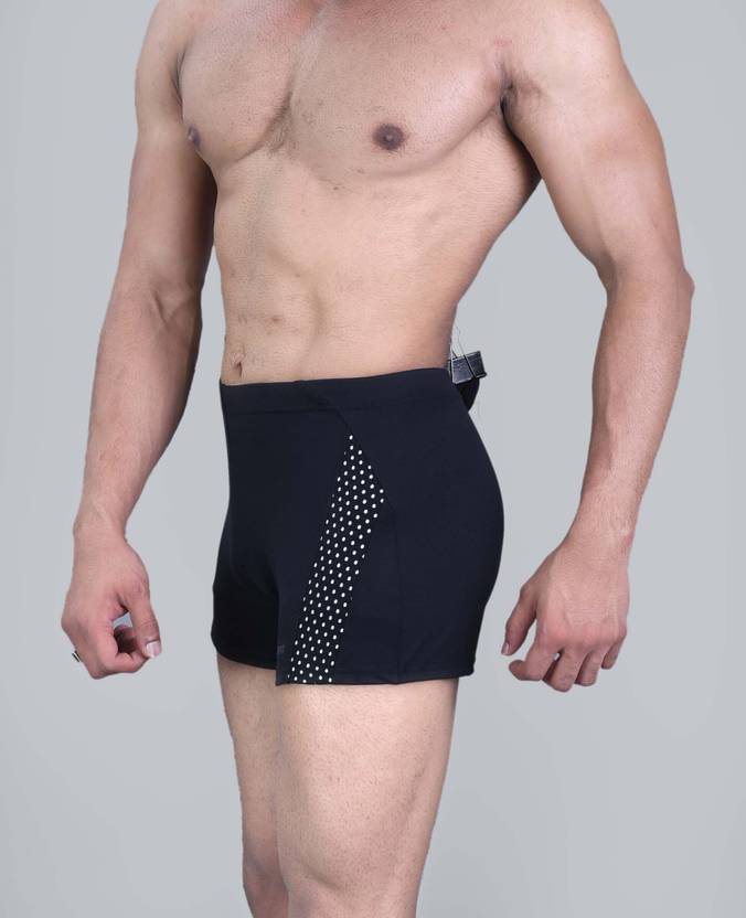 A pair of black mid-rise swimming trunks, has an elasticated waistband with an inner drawstring fastening for a custom fit, one Back zipper pocket . Made with breathable,lightweight,supportive and quick dry polyester elasten fabric